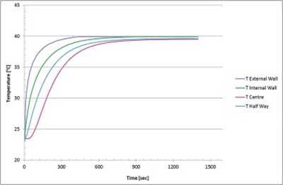 ¡¡¡¡Í¼2¡¢ µ±É豸´Ó»·¾³Ìõ¼þ×ªÒÆµ½40¡æµÄË®ÖÐʱ£¬´²ÖкÍÉ豸Íâ±íÃæÉϵÄζȷֲ¼¡£
