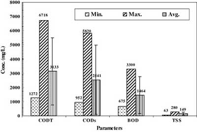 ¡¡¡¡ÑÇÂé·ÏË®µÄÀí»¯ÌØÐÔÈçͼ1Ëùʾ¡£½á¹û±íÃ÷£¬»¯Ñ§ÐèÑõÁ¿(COD)Ϊ127〜6718 mgO 2 / l£¬Æ½¾ùֵΪ3133 mg / L¡£´ËÍ⣬BODָʾµÄƽ¾ù¿ÉÉúÎï½µ½âÎïÖÊΪ1464mg / L¡£Æ½¾ùBOD / COD±ÈֵΪ0.467£¬±íÃ÷ÉúÎï½µ½âÄѶȽϴ󡣴ËÍ⣬×ÜÐü¸¡Îï´ïµ½149 ºÁ¿Ë/Éý¡£