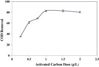 ¡¡¡¡Îü¸½¼Á¼ÁÁ¿ÔÚ·ÏË®ºó´¦ÀíÎü¸½¹ý³ÌÖÐÆð×ÅÖØÒªµÄ×÷Ó᣻îÐÔÌ¿¼ÁÁ¿´Ó0.25µ½ 2g / LµÄ±ä»¯½øÐÐÁ˼¸¸öʵÑ顣ͼ2ÏÔʾÁ˶ԻîÐÔÌ¿¼ÁÁ¿µÄÎü¸½ÈÝÁ¿(q)¡£ Ëæ×ÅÎü¸½¼ÁÓÃÁ¿Ôö¼Óµ½0.75g / L£¬CODµÄ²ÐÁôÁ¿´Ó470mg / L ½µÖÁ51mg / L£¬³¬¹ýÁËCODµÄÇá΢Ͻµ¡£Í¨¹ý½«Îü¸½¼Á(GAC)µÄ¼ÁÁ¿Ôö¼Óµ½ 2g / L£¬ÀàËÆÎïCODÈ¥³ý°Ù·Ö±È´Ó34.8%Ôö¼Óµ½81%¡£Òò´Ë£¬ ´Ó¾¼Ã½Ç¶ÈÀ´¿´£¬×î¼ÑµÄ»îÐÔÌ¿¼ÁÁ¿ÊÇ0.75g / L¡£