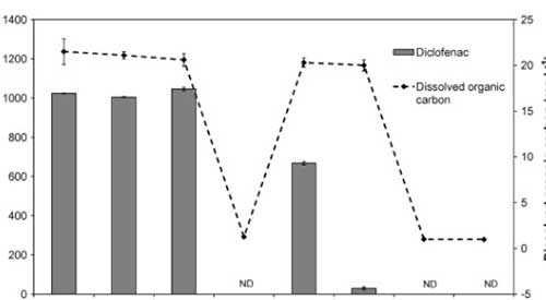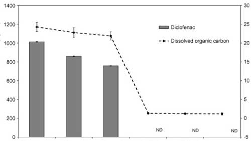 ¡¡¡¡Ê¹ÓûîÐÔÌ¿³ýȥ˫ÂÈ·ÒËáÄÆÊǶ¨ÐÔ¸ßЧµÄ£¬Í¨¹ýÁãÎüÊպ͵ÍŨ¶ÈµÄDOCµÄ£¬²¢ÇÒÔÚͨ¹ýËù»ñµÃµÄÉ«Æ×ÖÐûÓмì²âµ½Ë«ÂÈ·ÒËáÄÆ¡£µÃÔÚËùÑо¿µÄ´¦Àí½×¶ÎÖУ¬ÔÚ»îÐÔÌ¿ÉϵÄÎü¸½µ¼ÖÂ×îÏÔ×ŵÄË«ÂÈ·ÒËáÄÆÈ¥³ý¡£Òò´Ë£¬Ë«ÂÈ·ÒËáÄÆÃ»ÓÐË®ÑùÖеÄÕâ¸ö½×¶Î(LODÖ®ºó¼ì²â = 2 μg L−1)¡£¿¼Âǵ½ËùÊö·½·¨µÄ¶¨Á¿ÏÞΪ3 μg L−1£¬Í¨¹ý»îÐÔÌ¿³ýȥ˫ÂÈ·ÒËáÄÆµÄÖÁÉÙ99.7%¡£ÒòΪûÓÐÑо¿»îÐÔÌ¿µÄÆÆÁÑÇúÏߣ¬ËùÒÔ»îÐÔÌ¿µÄ½á¹û¿ÉÒÔ±»ÈÏΪÊǶ¨ÐԵġ£È»¶ø£¬ÎªÁËÑо¿ÔÚ´óÐÍË®´¦Àí³§ÖÐÈ¥³ýË«ÂÈ·ÒËáÄÆ£¬±ØÐë¸Ä½ø¸Ã·½·¨ÒÔ´ïµ½½ÏµÍµÄ¼ì²âÏÞ(Ô¼μg L−1)¡£