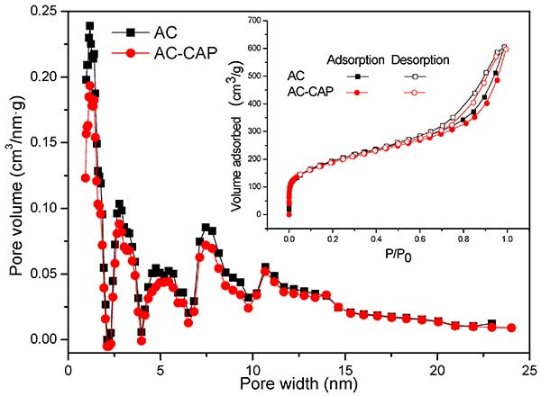 ¡¡¡¡Í¼1.ÔÚÂÈÃ¹ËØÎü¸½Ö®Ç°»îÐÔÌ¿µÄ·Ö×ÓÁ¿ ºÍN 2Îü¸½/½âÎüµÈÎÂÏß(²åÈë)ºÍÂÈÃ¹ËØÎü¸½Ö®ºóµÄ»îÐÔÌ¿¡£¿×¾¶·Ö²¼ÓÉÃܶȷºº¯ÀíÂÛ(DFT)·½·¨È·¶¨¡£