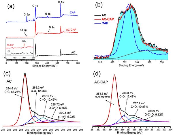 ¡¡¡¡ÎªÁ˽øÒ»²½Á˽â»îÐÔÌ¿Îü¸½ÂÈÃ¹ËØµÄ»úÀí£¬ÓÃXPS·ÖÎö»îÐÔÌ¿Îü¸½Ç°ºóµÄÂÈÃ¹ËØ(0.3 mmol / L)¡£Í¼2ÖÐʾ³öÁËXPS²âÁ¿¹âÆ×£¬»îÐÔÌ¿Îü¸½Ö®Ç°ºÍÖ®ºóµÄÂÈÃ¹ËØµÄO 1sºÍC 1s·å¡£ÓÉC 1sÆ×È·¶¨µÄ±íÃæ¹ÙÄÜ̼Ô×ӵļÆËãÏà¶Ôº¬Á¿Ò²ÁÐÓÚͼ 2c£¬dÖУ¬²¢ÇÒ¼ÆËãµÄÔ×Ó±ÈÂÊ×ܽᡣÖ÷ÒªµÄC 1s·å·ûºÏÒÔÏÂ×éµÄÎåÌõÇúÏߣº286.6eVµÄʯī½á¹¹£¬286.2eVµÄCO(±½·Ó£¬´¼»òÃÑ»ù)£¬287eVµÄC = O(ôÊ»ùºÍÃÑ»ù)£¬O = 288.7eV´¦µÄCO(ôÈ»ù»òõ¥»ù)£¬²¢ÇÒÔÚ290.5eV´¦π->π*ԾǨ¡£