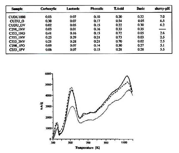 ¡¡¡¡Í¼1ÏÔʾÁ˹ýÑõ»¯Çâ´¦Àíºó²úÉúµÄ»îÐÔÌ¿µÄ»¯Ñ§ÐÐΪ¡£´ÓÉÏÃæ¿´³öµÄÑõ»¯¹ý³ÌÔö¼ÓÁË»îÐÔÌ¿µÄ×ÜËá¶È£¬²¢ÇÒÓëôÈ»ùºÍ·ÓÀà»ùÍŵÄÔö¼ÓÒ»Ö¡£´ËÍ⣬TPDÇúÏßÏÔʾÁ˷ųöÆøÌåµÄÔöÁ¿£¬·åÖµ¼¯ÖÐÔÚÓë»îÐÔÌ¿ÏàͬµÄζȡ£µÍκ͸ßηֽâ×éµÄÃæ»ý×ÜÌåÔö¼Ó¹éÒòÓÚôÈ»ù-ÄÚõ¥Àà½á¹¹ºÍºóÃæµÄ·ÓÀà»ùÍÅ¡£H2O2Ñõ»¯Ì¼µÄFT-IR¹âÆ×ÔÚ1542ºÍ1190cm-1´¦ÏÔʾ´ø¾ÍÏñÄÇЩÔʼµÄ̼£¬µ«ºóÀ´µÄ¿×϶ÒѾÀ©´ó£¬ÏÔʾ³öC-OÉìչģʽµÄÔö¼Ó¡£×ÜÖ®£¬ÕâЩÑо¿±íÃ÷½öÔÚHµÄÐÔÖʵÄС±ä»¯H2O2´¦Àí¹ýµÄ̼£¬¼´£¬ÊÇÔÚÑõ»¯Ê±£¬ÆäÀàËÆÓÚÓÉÆäËûÑо¿ÈËÔ±±¨¸æµÄÐÐΪûÓй۲쵽±ä»¯ÏÔÖø¡£ÆäÖйýÑõ»¯ÇâÈÜÒºµÄÑõ»¯×÷ÓÃÃ÷ÏԵؿ´×÷ôÈËáÀà»ùÍŵÄÖØÒª¼õÉÙ£¬°éËæ×żîÐÔ»ùÍŵĴóÁ¿Ôö¼Ó¡£