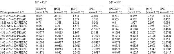 ¡¡¡¡ÎªÁËÈ·±£Ni 2+µÄI PEIÖµµÄ¼ò½àºÍ¼òµ¥£¬ »¹»ùÓÚÓÃÓÚ¼ÆËã Cu 2+µÄI PEIÖµµÄ·½·¨¼ÆËã¡£±í2±È½ÏÁËÓÃÓÚPEI½þ×յĻîÐÔÌ¿µÄCu 2+ºÍNi 2+µÄ²â¶¨µÄI PEIÖµ¡£ºÜÃ÷ÏÔ£¬8.41%(ÖØÁ¿)423-PEI /»îÐÔÌ¿¾ßÓÐ×î¸ß[PEI-Cuϵ2+ ]Öµforv¶þÕßµÄCu 2+ºÍNi 2+ÔÚ3.253ºÍ0.452ºÁĦ¶û´óºÅ-1·Ö±ð¡£Õâ±íÃ÷±íÃæ8.41ÖØÁ¿%µÄ423-PEI /»îÐÔÌ¿¾ßÓÐ×î¸ßŨ¶ÈµÄPEI-Cu 2+ºÍPEI-Ni2+ ÓëÆäËûPEI½þ×յĻîÐÔÌ¿Ïà±È½Ï¡£¶ÔÓÚ4.76ÖØÁ¿%µÄ423-PEI /»îÐÔÌ¿£¬3.10ÖØÁ¿%µÄ600-PEI /»îÐÔÌ¿£¬1.40ÖØÁ¿%µÄ1200-PEI /»îÐÔÌ¿ºÍ2.08ÖØÁ¿%µÄ1200-PEI /»îÐÔÌ¿£¬¹Û²ìµ½[PEI]ºÍI PEIµÄ¸ºÖµ¡£»îÐÔÌ¿Ìṩ»îÐÔÌ¿±íÃæÉÏËùÐèµÄPEI·Ö×ÓÊýÁ¿²»×ãÒÔʵÏÖÏÔ×ŵÄÂçºÏ·´Ó¦¡£¼ÆËãµÄI PEIÖµ³ÊÏÖ³öÏ൱ÓÐȤµÄ½á¹û£¬ÒòΪËüÃÇËÆºõËæ×Ų»Í¬ÀàÐ͵Äwt.%£¬PEIÀàÐͺͽðÊôÀë×Ó¶ø±ä»¯¡£ÎªÁËÎü¸½Cu 2+£¬ÎÒPEI¶ÔÓÚ8.41ÖØÁ¿%µÄ423-PEI /»îÐÔÌ¿£¬4.51ÖØÁ¿%µÄ600-PEI /»îÐÔÌ¿ºÍ3.54ÖØÁ¿%µÄ1200-PEI /»îÐÔÌ¿£¬¹Û²ìµ½×î¸ßµÄÖµ¡£Õâ±íÃ÷ÔÚÕâЩ»îÐÔÌ¿ÑùÆ·µÄ±íÃæÉÏCu 2+ºÍPEI Ö®¼äµÄÏ໥×÷Óó̶È(Æä×îÖÕµ¼ÖÂÂçºÏ)¶ÔÓÚÿÖÖÀàÐ͵ÄPEIÊÇ×î¸ßµÄ¡£ÕâÊÇÓÉÓÚ»îÐÔÌ¿±íÃæ´æÔÚ×î¼ÑµÄACI·Ö×Ó£¬ÓëCu 2+½Ó´¥µÄÁ¿×ã¹»£¬ ¶øÀÛ»ý¿×Ìå»ýµÄ¼õÉÙ×îС»¯¡£
