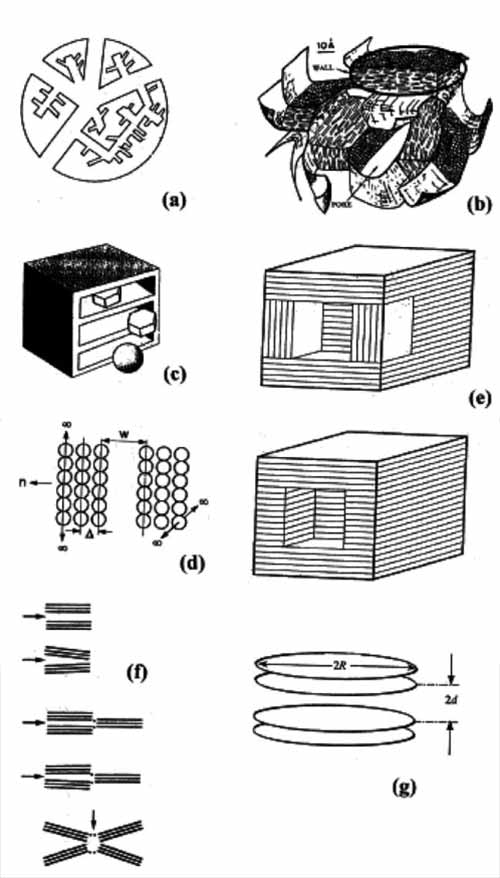 ¡¡¡¡Í¼1£º»îÐÔÌ¿¿×϶ÂÊÄ£ÐÍ£¬(a)¾¶Ïò·Ö²¼Ô²Öù¿×Íø£¬(b)ÖåÖ½£¬(c-d)ÏÁ·ì×´¿×£¬(e)Á¢·½Ìå×´ÏÁ·ì×´¿×£¬(f-g)΢¾§·½·¨¡£