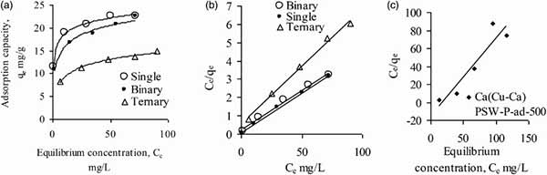 ¡¡¡¡Í¼1. Cu(II)(a£¬b)ºÍCa(II)(c)µÄLangmuirµÈÎÂÏߣ¬¶øCu(II)Îü¸½ÊÇ´Óµ¥(Cu)£¬¶þÔª(Ca-Cu)ºÍÈýÔª(Cu-Ni-)½øÐеÄPb)ÈÜÒººÍCa(II)±»»îÐÔÌ¿Îü¸½ÔÚ¶þÔªÈÜÒº(Ca-Cu)ÖУ¬³õʼpHֵΪ5£¬³õʼŨ¶È´Ó<0µ½<100 mg L-1¡£