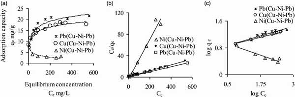 ¡¡¡¡Í¼2.³õʼpHֵΪ5µÄ»îÐÔÌ¿µÄÈýÔªÈÜÖÊ£¬Cu(II)£¬Ni(II)ºÍPb(II)µÄLangmuir·ÇÏßÐÔ(a)£¬ÏßÐÔ(b)ºÍFreundlich(c)µÈÎÂÏß¶øËüÃǵijõʼŨ¶È±ä»¯£¬´Ó<0µ½≤600mg L-1¡£(·ÖÎöNiÑùÆ·µÄŨ¶È·¶Î§¸ß´ï305mg L -1)¡£