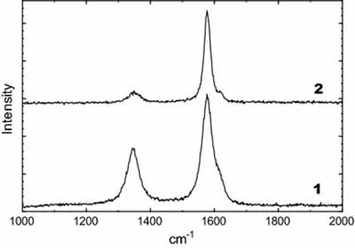 ¡¡¡¡Í¼1£º»îÐÔÌ¿µÄÀÂü¹âÆ×£º1¡¢»îÐÔÌ¿-A£¬2¡¢»îÐÔÌ¿-B¡£