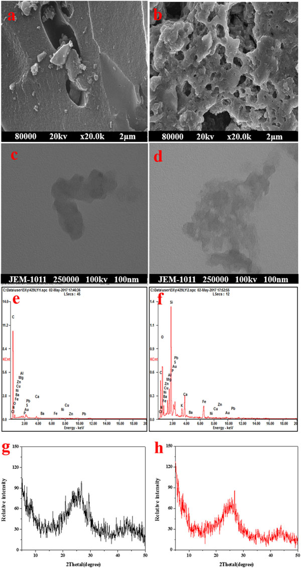 ¡¡¡¡Í¼1£ºÁ½ÖÖÎü¸½¼ÁµÄ´ú±íÐÔSEM£¬TEMºÍEDSͼÏñ¡£(a)»îÐÔÌ¿µÄSEM(±ÈÀý³ßΪ2μm)£¬(b)»îÐÔÌ¿µÄTEM(±ÈÀý³ßΪ100nm)£¬(c)»îÐÔÌ¿µÄEDS£¬(d)¸ÄÐÔ»îÐÔÌ¿µÄSEM(±ÈÀý³ßΪ2μm)£¬(e)¸ÄÐÔ»îÐÔÌ¿µÄTEM(±ÈÀý³ßΪ100nm)£¬(f)¸ÄÐÔ»îÐÔÌ¿µÄEDS£¬(g)»îÐÔÌ¿µÄXRD£¬(h)¸ÄÐÔ»îÐÔÌ¿µÄXRD¡£