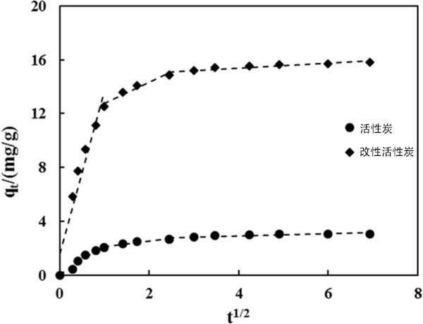 ¡¡¡¡»Ç°·¶þ¼×à×à¤ÔÚ»îÐÔÌ¿ºÍ¸ÄÐÔ»îÐÔÌ¿ÉϵÄÎü¸½ºÍÀ©É¢¹ý³Ì¿É·ÖÈý¸ö½×¶ÎÃèÊö£¬Èçͼ2Ëùʾ¡£ÓÉÓÚÔÚµÚÒ»½×¶ÎÎü¸½ÔÚ»îÐÔÌ¿±íÃæÉÏ£¬Îü¸½ËÙÂÊ×î³õºÜ¸ß¡£È»ºó£¬·¢Éú¿ìËٵĿÅÁ£ÄÚÀ©É¢¹ý³Ì£¬ÆäÖлǰ·¶þ¼×à×à¤Öð½¥Îü¸½ÔÚ»îÐÔÌ¿ÉÏ£¬²¢ÇÒÎü¸½ËÙÂʳ£ÊýÖð½¥½µµÍ¡£ÔÚµÚÈý½×¶Î£¬±ß½ç²ãºÍ´«ÖÊ×èÁ¦µÄÓ°ÏìÔö¼Ó£¬µ¼Ö¿ÅÁ£ÄÚÀ©É¢¼õÂý¡£ËùÓÐÈý¸ö½×¶ÎµÄÄâºÏ·½³Ì¶¼Ã»ÓÐͨ¹ý×ø±êµÄԵ㣬Õâ±íÃ÷¿ÅÁ£ÄÚÀ©É¢²»ÊÇ¿ØÖÆÎü¸½ËÙÂʵÄΨһ²½Öè¡£Òò´Ë£¬Îü¸½¹ý³ÌÒ²ÊÜĤÀ©É¢ºÍ±íÃæÎü¸½µÄÓ°Ïì¡£