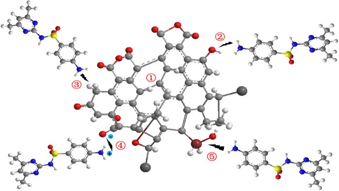 ¡¡¡¡Í¼3£º»Ç°·¶þ¼×à×ऺ͸ÄÐÔ»îÐÔ֮̿¼äºÏÀíÏ໥×÷ÓõÄʾÒâͼ¡£1.΢¿×²¶»ñ¡£2.Çâ¼üÏ໥×÷Óá£3.π-πEDAÏ໥×÷Óá£4.¾²µçÏ໥×÷Óá£5.ÅäλÏ໥×÷Óá£