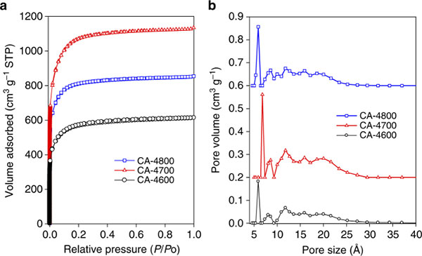 ¡¡¡¡ºÏ³É¸»º¬ÑõµÄ»îÐÔÌ¿£¬¾ßÓеÍˮƽµÄʯ¡£ÎªÁËÓÃ×÷´¢Çâ²ÄÁÏÊÇÓÐÓõ쬻îÐÔÌ¿ÏÔʾ³ö¿×϶ÂÊÖ÷ÒªÔ´×Ô΢¿×¸ßˮƽ¡£Ê¹ÓõªÎü¸½·ÖÎö̽²â»îÐÔÌ¿µÄ¿×϶ÂÊ¡£»îÐÔÌ¿µÄµªÎü¸½µÈÎÂÏßÈçͼ1aËùʾ¡£ËùÓÐÈý¸öÑùÆ·¶¼ÏÔʾ³öͨ³£ÎªÎ¢¿×²ÄÁÏ»ñµÃµÄIÐ͵ÈÎÂÏß¡£Ëæ×ŻζȴÓ600¡æ±ä»¯µ½700¡æ£¬Îü¸½µÄµªÁ¿(ÆäΪ̼Öп×϶ÂʵÄÁ¿¶È)ÏÔ×ÅÉÏÉý£¬È»ºóÔÚ800¡æÏÂÖÆ±¸µÄÑùƷϽµ¡£È»¶ø£¬µÈÎÂÏßµÄÐÎ×´¼¸ºõûÓб仯£¬Õâ±íÃ÷¾¡¹Ü¿×϶ÂÊ´ó´óÔö¼Ó£¬µ«ÈÔ±£³Ö΢¿×µÄˮƽ¡£Ôö¼ÓÁË×ܵĿ×϶ÂÊÔÚ»îÐÔ̿ͨ³£ÓëÔÚµÈÎÂÏßµÄÐÎ×´µÄ±ä»¯Ïà¹ØÁª£¬ÓÈÆäÊǼӿíÎü¸½¡£