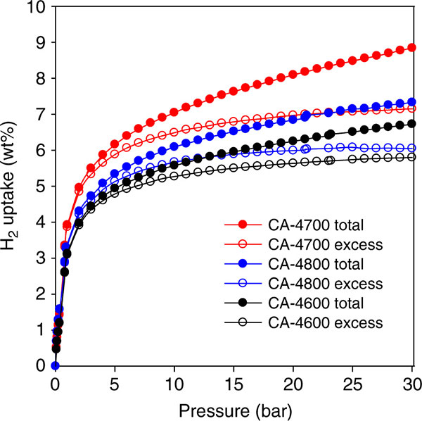 ¡¡¡¡»îÐÔÌ¿ÖеÄÇâ´¢´æÐèÒª¾ßÓÐ×î¸ß±íÃæ»ýºÍÊʵ±³ß´çµÄ¿×µÄ²ÄÁÏ¡£ÔÚ-196ºÍ25¡æÏÂʹÓÃÖØÁ¿·¨ÔÚHidenXEMIS·ÖÎöÒÇÉÏÔÚ0-30°ÍµÄѹÁ¦·¶Î§ÄÚÑо¿»îÐÔÌ¿µÄ´¢ÇâÄÜÁ¦¡£Í¼2ÏÔʾÁË»îÐÔÌ¿ÔÚ-196¡æÏµĹýÁ¿ºÍ×ÜÇâÎüÊÕµÈÎÂÏß¡£¶ÔÓÚËùÓÐCA-4T»îÐÔÌ¿£¬ÇâÎüÊÕÊÇ¿ÉÄæµÄ£¬Ã»ÓÐÖͺóÏÖÏ󣬲¢ÇÒÔÚ0-30°ÍµÄѹÁ¦·¶Î§ÄÚûÓдﵽ±¥ºÍ¡£ÎÒÃÇÊ×ÏÈ×¢Òâµ½1°ÍµÄÇâÎüÊշdz£ÁîÈËÓ¡ÏóÉî¿Ì£¬ÔÚ3.1-3.9wt%µÄ·¶Î§ÄÚ¡£ÕâÖÖ´¢Çâ±ÈΪ¸ß±íÃæ»ý»îÐÔÌ¿ÇãÏòÓÚÔÚ2-3ÖØÁ¿%·¶Î§ÄÚµÄÈκα¨¸æµÄÖµ¸ßµÃ¶à¡£ÎÒÃǽ«ÕâÖÖÌØ±ð¸ßµÄÎüÊÕÌØÐÔ¹éÒòÓڷdz£¸ßµÄ΢¿×±íÃæ»ýºÍ¸»Ñõ±íÃæµÄ×éºÏ£¬ÌرðÊǶÔÓÚ3.9ÖØÁ¿%µÄ»îÐÔÌ¿ÑùÆ·CA-4700¡£¸»Ñõ±íÃæµÄЧ¹ûÊǶÔÓÚ»îÐÔÌ¿ÑùÆ·CA-4600£¬Æä¾¡¹Ü¾ßÓÐÊʶÈ×ܱíÃæ»ýºÍ΢¿×±íÃæ£¬ÈÔÈ»±íÏÖ³öµÄÎüÊÕ±ÈÒÔǰ·¢ÏֵĻîÐÔÌ¿²ÄÁϾßÓиߵöàµÄ±íÃæ»ý¡£¾¹ýÑо¿·¢ÏÖ£¬¾ßÓÐÑõ¹ÙÄÜÍŵĻîÐÔ̿Ч¹ûÔ¤ÆÚÔÚµÍѹϾßÓÐ×î´óЧ¹û£¬ÆäÖÐÇâºÍ±íÃæÖ®¼äµÄÏ໥×÷ÓñÈÔڽϸßѹÁ¦Ï¸üÖØÒª£¬ÆäÖÐͨ¹ý¿Õ¼äÌî³ä»úÖÆ¸ü¿ÉÄÜ·¢ÉúÇâÎüÊÕ¡£