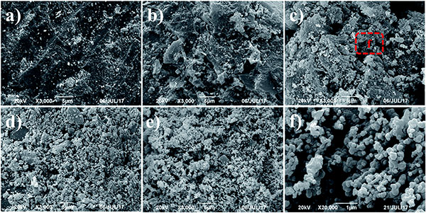 ¡¡¡¡Í¼1¡¢²»Í¬Ñõ»¯Ã¾º¬Á¿µÄ¸ÄÐÔ»îÐÔÌ¿µÄͼÏñ£º(a)»îÐÔÌ¿£¬(b)»îÐÔÌ¿ÖÐÑõ»¯Ã¾º¬Á¿5%£¬(c)»îÐÔÌ¿ÖÐÑõ»¯Ã¾º¬Á¿10%£¬(d)»îÐÔÌ¿ÖÐÑõ»¯Ã¾º¬Á¿20%£¬(e)»îÐÔÌ¿ÖÐÑõ»¯Ã¾º¬Á¿30%ºÍ(f)»îÐÔÌ¿ÖÐÑõ»¯Ã¾º¬Á¿10%·Å´óµÄSEMͼÏñ¡£