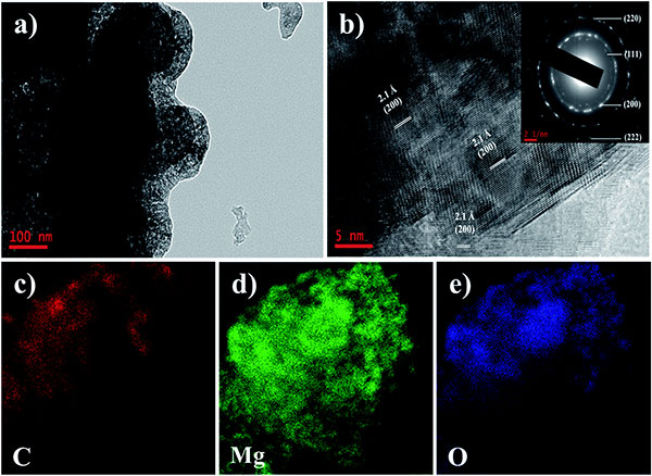 ¡¡¡¡ÎªÁ˽øÒ»²½½Òʾ¸ÄÐÔ»îÐÔÌ¿µÄ΢¹Û½á¹¹£¬ÎÒÃǽøÐÐÁËTEM£¬Ñ¡ÔñÇøÓòµç×ÓÑÜÉä(SAED)ºÍÄÜÁ¿É«É¢Æ×(EDS)²âÁ¿¡£ÓÉÓÚËùÓÐÑùÆ·¾ßÓÐÏàËÆµÄÐÎ̬£¬Òò´ËÑ¡Ôñ»îÐÔÌ¿ÖÐÑõ»¯Ã¾º¬Á¿10%µÄÑùÆ·×÷ΪµäÐÍʵÀý¡£TEMͼÏñ(²Î¼ûͼ2a)ÏÔʾÑùÆ·ÓÉÐí¶àСµÄÑõ»¯Ã¾ÄÉÃ×¾§ÌåºÍ̼»ùÖÊ×é³É¡£Í¼2bÏÔʾ¸ÄÐÔ»îÐÔÌ¿µÄHR-TEMͼÏñ¡£²ã¼ä¾àΪ2.1µÄÑõ»¯Ã¾¾§¸ñÌõÎÆ¹éÒòÓÚÁ¢·½Ñõ»¯Ã¾µÄ(200)¾§¸ñÃæ¡£ÏàÓ¦ÑùÆ·µÄSAEDͼ°¸(ͼ2bµÄ²åͼ)ÏÔʾÃ÷ÁÁµÄԲȦ»·£¬±íÃ÷ËùÑ¡ÇøÓòÖÐÑõ»¯Ã¾µÄ¶à¾§ÐÔÖÊ¡£·ÖÅ䏸Ñõ»¯Ã¾µÄ(111)£¬(200)£¬(220)ºÍ(222)·´ÉäµÄÑÜÉäͬÐÄ»·ÊÇÃ÷ÏԵ쬲¢ÇÒ½á¹ûÓë´ÓXRDÊý¾Ý»ñµÃµÄÑõ»¯Ã¾Æ½ÃæÒ»Ö¡£Èçͼ2c-eËùʾ£¬EDSÓ³Éä½á¹û±íÃ÷þºÍÑõÔªËØ¾ùÔÈ·Ö²¼ÔÚ»îÐÔÌ¿±íÃæ¶ø²»ÊÇÃ÷ÏԵľۼ¯¡£