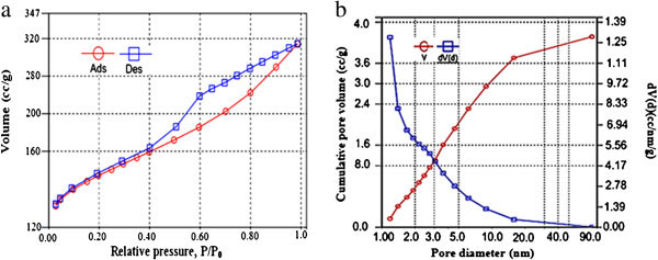 图3、活性炭的氮吸附/解吸等温线(a),活性炭颗粒的孔径分布(b)。