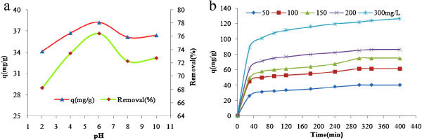 图4、pH值(a)在浓度=50 mg/L和接触时间(b)对浓度=50-300 mg/L的影响,苯胺吸附在活性炭上,W=1 g/L T=20℃。