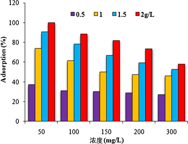 图5、各种苯胺浓度对其在活性炭上的吸附的影响:pH=6,t=300min,浓度 = 50-300mg/L,W=0.5-2g/L和T=20℃。