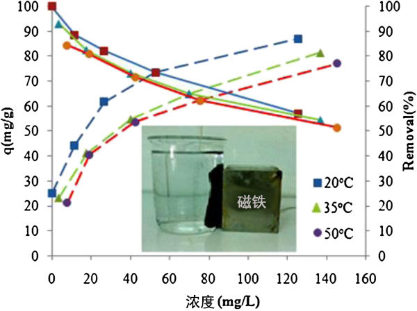 图6、各种温度对对活性炭吸附苯胺的影响:pH=6,t=300 min,浓度=50-300 mg/L,W=2 g/L,T=20-50°C。