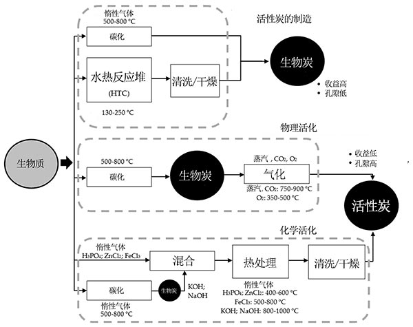 一般而言,活性炭吸附剂可以由其组成中具有高比例碳的任何前体制造。因此,生物质材料是活性炭吸附剂的理想前体。在这项研究中,生物质在热处理后得到生物炭,生物炭经过进一步活化,而在活化步骤后获得活性炭。常见的生物质材料如橄榄核等等。图2显示了生物质的活性炭制造方法。生物炭通常在碳化时制备,而活性炭需要使用物理和化学活化产生更加发达的孔隙。合成的活性炭的孔隙率,表面化学和产率高度依赖于起始生物质组成和合成中使用的操作条件。