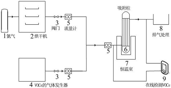 ¡¡¡¡ÔÚÎü¸½ÖùÖÐÑо¿ÁË»îÐÔÌ¿Îü¸½¼×±½µÄÄÜÁ¦¡£»îÐÔÌ¿µÄÓÃÁ¿Îª10g£¬Îü¸½Öʼױ½ÆøÌåÓÉÆøÌå·¢ÉúÆ÷²úÉú¡£Í¨¹ý²â¶¨Îü¸½Ç°ºó¼×±½µÄŨ¶È£¬µÃµ½Á˲»Í¬Ìõ¼þÏ»îÐÔÌ¿Îü¸½ÐÔÄܵÄÊý¾Ý¡£ÊµÑéÎü¸½×°ÖõÄÁ÷³ÌͼÈçͼ2Ëùʾ¡£½«À´×ÔÆøÌå·¢ÉúÆ÷µÄ¼×±½ÆøÌåÓëµªÆø»ìºÏ£¬È»ºó½«ÆäÎü¸½ÔÚºãÎÂÎü¸½ËþÖС£Í¨¹ýÔÚÏßFID¼ì²âÆ÷²âÁ¿Îü¸½Ç°ºóµÄ¼×±½º¬Á¿£¬²¢Í¨¹ýÁ÷Á¿¼Æ¿ØÖƼױ½Á÷Á¿¡£µ±ÍÑÆøºÍÈë¿ÚŨ¶ÈÔÚ30·ÖÖÓÄÚ±£³ÖÒ»ÖÂʱ£¬ÈÏΪÒÑ´ïµ½Îü¸½Æ½ºâ¡£Îü¸½ÆøÌåͨ¹ý·ÏÆø³ö¿ÚÅſա£