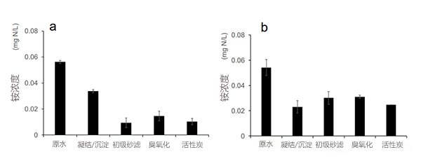 ¡¡¡¡Í¼1£ºÁ½ÖÖÑùÆ·ÖÐÔË®ÖеÄï§Å¨¶ÈºÍË®¾»»¯¹ý³ÌµÄÁ÷³öÎï(¼´Ã»ÓÐÔ¤ÂÈ»¯(a)ºÍÔ¤ÂÈ»¯(b)¡£