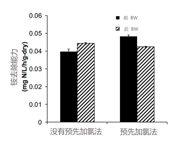 ¡¡¡¡Í¼2ÏÔʾÁË·´Ï´Ç°ºó»îÐÔÌ¿µÄï§È¥³ýÄÜÁ¦µÄ±ä»¯¡£Ã»ÓÐÔ¤ÂÈ»¯£¬ï§È¥³ýÄÜÁ¦Îª0.040mgN/L/h/g-dry¡£ÔÚµÚÒ»´ÎÈ¡Ñùºó·´Ï´(p<0.01)ºó£¬ËüÔö¼ÓÁË12%¡£ÁíÒ»·½Ã棬µ±ÊµÊ©Ô¤ÂÈ»¯Ê±£¬È¥Ï´ºóµÄÈ¥³ýÄÜÁ¦½µµÍÁË12%(´Ó0.048µ½0.042mg N/L/h/g-dry)(p<0.01)¡£