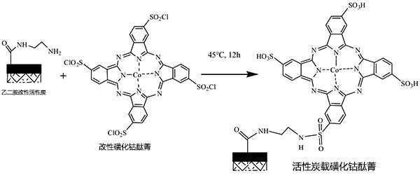 活性炭本身的孔隙结构发达,拥有大的比表面积和高吸收率与稳定性。然而,活性炭按平常的方法浸渍磺化酞菁钴催化剂会存在负载型催化剂的活性成分损失的问题,导致再利用性能不令人满意。因此,应通过化学接枝方法在活性炭上载入CoPcS。