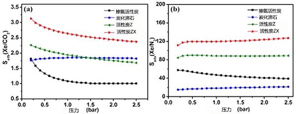 ¡¡¡¡Í¼4¡¢¼¸ÖÖ»îÐÔÌ¿ÑùÆ·Îü¸½Ñ¡ÔñÐÔ·Ö±ðΪ(a)Xe/CO 2£¬(b)Xe/N 2£¬Ä¦¶û·ÖÊýy CO2=0.99£¬y N2=0.99¡£