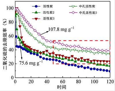 ¡¡¡¡ÎªÁ˸üºÃµØÀí½â¿×½á¹¹µÄ×÷Óã¬ÎÒÃÇÑо¿ÁË»îÐÔÌ¿Îü¸½¼ÁÖп׾¶ºÍ¿×϶ģʽµÄÓ°Ïì¡£´Ó½á¹¹±íÕ÷À´¿´£¬³¬Î¢¿×Ìå»ýºÍ΢¿×Ìå»ýËÆºõÖ±½ÓÓ°Ï첻ͬÑùÆ·µÄSO 2Îü¸½ÄÜÁ¦¡£¿¼Âǵ½ÑÌÆøÖдæÔÚO2ºÍH2Oµ¼Ö»îÐÔÌ¿Îü¸½¼ÁÖеÄһϵÁд߻¯Ñõ»¯ºÍH 2 SO 4Ðγɷ´Ó¦£¬Ñо¿ÁËÄ£ÄâÑÌÆøÖеÄSO 2È¥³ý¶¯Á¦Ñ§£¬Èçͼ2Ëùʾ¡£²»Í¬ÓÚSO 2È¥³ýЧÂÊѸËÙϽµÔÚSO 2·ÖÀëÎü¸½¹ý³ÌÖУ¬ÔÚ15·ÖÖÓÄÚ£¬SO 2È¥³ýЧÂÊÖð½¥Ï½µµ½Ò»¸öÖµ£¬²¢ÇÒ¼¸ºõ±£³ÖÎȶ¨£¬ÈçºìÉ«¿òÖÐËùʾ¡£Ïà±È֮ϣ¬Öп׻îÐÔÌ¿´ó´óÌá¸ßÁËÁòÈÝÁ¿£¬Èçͼ2Ëùʾ¡£¾ßÓÐÏàËÆÎ¢¿×ÌØÕ÷µÄ»îÐÔÌ¿±ÈÖп×ÉÙ25%µÄÁòÈÝÁ¿¡£Òò´Ë£¬²»Í¬µÄSO 2È¥³ý¶¯Á¦Ñ§ºÍÁòÈÝÁ¿±íÃ÷£¬ÔÚO2ºÍH2O´æÔÚÏ£¬Öп׺Ϳ×϶ģʽӦ¶ÔSO 2µÄÈ¥³ý²úÉúñîºÏÓ°Ïì¡£