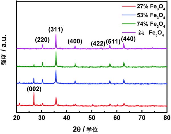 ¡¡¡¡Ê¹ÓÃXRDÑÜÉäÒDzâÁ¿»îÐÔÌ¿¸´ºÏÎïµÄ¾§Ìå½á¹¹¡£Í¼1ÏÔʾÁËËùÖÆ±¸ÑùÆ·µÄÑÜÉäͼ°¸¡£ÔÚ2µÄÌØÕ÷ÑÜÉä·åθ= 31.24°£¬36.82°£¬44.76°£¬55.62°£¬59.30°ºÍ65.19°µÄÓë(220)£¬(311)£¬(400)£¬(422)£¬(511)ºÍ(440)Fe 3 O 4Æ½ÃæÒ»Ö¡£´ËÍ⣬ÔÚÔ¼2·åÖµθ=26.20°±»·ÖÅ䏸ÅîËɽṹ»¯»îÐÔÌ¿¡£¹Û²ìµ½Fe 3 O 4ÑÜÉä·åµÄÇ¿¶ÈËæ×ÅFe 3 O 4ÄÉÃ׿ÅÁ£¸ºÔØÁ¿µÄÔö¼Ó¶øÔöÇ¿£¬²¢ÇÒ»îÐÔÌ¿µÄÇ¿¶ÈÔÚÏàͬµÄ¹ý³ÌÖмõÉÙ¡£ÉÏÊöÏÖÏó±íÃ÷Fe 3 O 4ÄÉÃ׿ÅÁ£¿ÉÒԳɹ¦µØÒýÈëÅîËɽṹµÄ»îÐÔÌ¿ÉÏ¡£