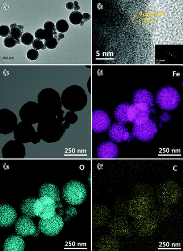 ¡¡¡¡»îÐÔÌ¿¸´ºÏÎïµÄTEMͼÏñºÍÏàÓ¦µÄÔªËØ·Ö²¼Ê¾ÓÚͼ5ÖС£Èçͼ£¬ËùÖÆ±¸µÄ»îÐÔÌ¿¾ù½Ó½üÇòÐΣ¬Á£¾¶Ö÷Òª¼¯ÖÐÔÚÔ¼250nm¡£´Óͼ3(b)ÖеÄHR-TEMͼÏñ¿ÉÒÔÇå³þµØ¹Û²ìµ½µ¥¸öFe 3 O 4ÄÉÃ׿ÅÁ£µÄÁ¼ºÃ¾§Á£È¡Ïò£¬²¢ÇÒ¸ÃÇøÓòÖеÄSAEDͼ°¸Ò²ÏÔʾ³öFe 3 O 4µÄ½á¾§ÌØÕ÷¡£Èçͼ3(c-f)Ëùʾ£¬ÆäÖпÉÒÔÇå³þµØ¹Û²ìµ½¸´ºÏ²ÄÁÏÓÉFe£¬OºÍCÔªËØ¡£CµÄ·Ö²¼ÇøÓòÃ÷ÏÔ´óÓÚFeºÍOµÄÏàÓ¦ÇøÓò£¬±íÃ÷ÌúÄÉÃ׿ÅÁ£·Ö²¼ÔÚ»îÐÔÌ¿µÄ±íÃæÉÏ¡£Òò´Ë£¬½áºÏXRD£¬VSMºÍSEM½á¹û£¬ÎÒÃÇ¿ÉÒԵóö½áÂÛ£¬Fe 3 O 4 ÄÉÃ׿ÅÁ£½ôÃÜÕ³¸½ÔÚ»îÐÔÌ¿µÄ±íÃæÉÏ¡£