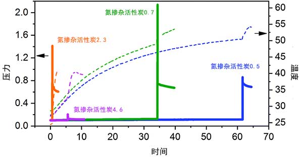 ¡¡¡¡Í¼2£º ²»Í¬ÖÊÁ¿µÄµª²ôÔÓ»îÐÔÌ¿»úе»¯Ñ§ºÏ³ÉµÄζÈ(ÐéÏß)ºÍѹÁ¦(ʵÏß)ÇúÏß¡£