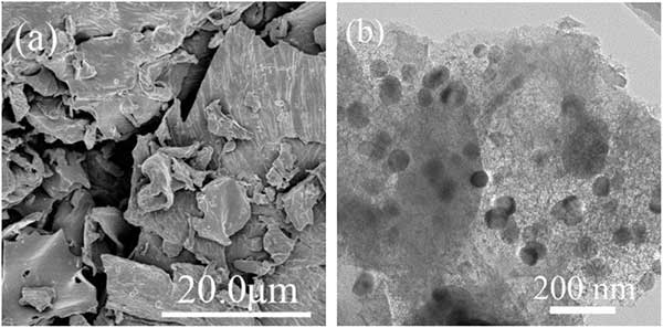 ¡¡¡¡Í¼1£º»îÐÔÌ¿(a)µÄɨÃèµç×ÓÏÔ΢¾µÐÎ̬ºÍÄÉÃ×Áã¼ÛÌú¸ºÔØ»îÐÔÌ¿µÄ͸Éäµç×ÓÏÔ΢¾µÍ¼Ïñ(b)¡£