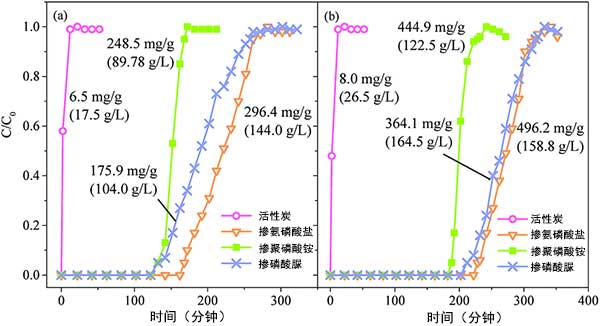 ¡¡¡¡»îÐÔÌ¿¶Ô¼×±½µÄ´©Í¸ÇúÏßÒÔ¼°Îü¸½ÈÝÁ¿Èçͼ2Ëùʾ¡£Ã»²ôµªµÄ»îÐÔÌ¿±íÏÖ³ö½Ï²îµÄ¼×±½Îü¸½ÐÔÄÜ£¬Îü¸½ÈÝÁ¿·Ö±ðΪ6.5ºÍ8.0mg g-1¡£Óë²ôµª»îÐÔÌ¿Ïà±È£¬Ìí¼Óº¬µªÁ×ËáÑεĻîÐÔÌ¿ÐèÒª¸ü³¤µÄʱ¼ä²ÅÄܽӽüÍ»ÆÆ²¢±íÏÖ³ö¸ü¸ßµÄÎü¸½ÄÜÁ¦¡£¶ÔÓÚÔÚ600¡æÏÂÖÆ±¸µÄ»îÐÔÌ¿£¬Æä¾º¬µªÁ×ËáÑδ¦ÀíµÄ»îÐÔÌ¿µÄÍ»ÆÆÊ±¼äΪ°±Á×ËáÑλîÐÔÌ¿>Á×Ëáëå»îÐÔÌ¿>¾ÛÁ×Ëáï§»îÐÔÌ¿£¬ÆäÏàÓ¦µÄÌå»ýÎü¸½ÈÝÁ¿Îª144.0£¬104.0ºÍ89.8g L-1£¬ÖÊÁ¿Îü¸½ÈÝÁ¿·Ö±ðΪ296.4£¬175.9ºÍ245.8 mg g-1£¬·Ö±ð¡£Óë600¡æÏà±È£¬900¡æÖƱ¸µÄ»îÐÔÌ¿¾ßÓиü¸ßµÄ¼×±½ÎüÊÕÁ¿£¬Ìå»ýÎü¸½ÈÝÁ¿Îª122.5-164.5g L -1£¬ÖÊÁ¿Îü¸½ÈÝÁ¿Îª364.1~496.2 mg g-1¡£ÖµµÃ×¢ÒâµÄÊÇ£¬¿ÉÒÔ¿´³ö°±Á×ËáÑδ¦ÀíµÄ»îÐÔÌ¿¾ßÓнϸߵÄÖÊÁ¿Îü¸½ÄÜÁ¦£¬¶øÁ×Ëáëå´¦ÀíµÄ»îÐÔÌ¿¾ßÓнϸߵÄÌå»ýÎü¸½ÄÜÁ¦¡£Õâ¿ÉÄܹéÒòÓÚËüÃDz»Í¬µÄ¶Ñ»ýÃܶȣ¬°±Á×ËáÑξßÓбÈÁ×Ëáëå¸ü¸ßµÄ¶Ñ»ýÃܶȡ£