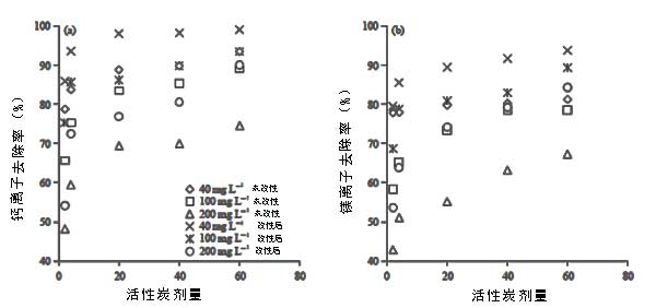 ¡¡¡¡¶ÔÓÚÎü¸½ÊµÑ飬½öÑо¿ÓÃ3.0wt%KMnO 4ÈȽâºÍ¸ÄÐԵĻîÐÔÌ¿£¬ÄܶÔÓÚË®´¦Àí×ã¹»Îȶ¨²¢ÇÒÒÔ½ÏСµÄÈȽâζÈÉú²ú¡£Òò´Ë£¬Ñ¡Ôñ¸ÃÑùÆ·ÓÃÓÚÏßÊøÒÆ³ýʵÑé¡£ÖµµÃ×¢ÒâµÄÊÇ£¬ÈȽâµÄδ¸ÄÐÔ»îÐÔÌ¿ÔÚˮӲ¶ÈÈÜÒºÖÐÏ൱²»ÈÜ¡£Õâ±íÃ÷ÈȽâµÄδ¸ÄÐÔ»îÐÔÌ¿µÄ±íÃæÊǷdz£ÊèË®µÄ¡£ÔÚ»îÐÔÌ¿¶ÔCa 2+ºÍMg 2+Àë×ÓµÄÎü¸½Ð§ÂÊÖпÉÒÔ¿´³ö£¬Ca2+µÄÎü¸½Ð§ÂʺÍMg 2+Àë×ÓÔö¼ÓÁËÓë¾ßÓÐÏàͬӲ¶ÈŨ¶ÈµÄÈÜÒºÔö¼ÓÎü¸½¼ÁÓÃÁ¿£¬²¢ÓÃÓ²¶ÈŨ¶ÈµÄÔö¼Ó¶ø½µµÍ¶ÔÓÚÏàͬµÄÎü¸½¼Á¼ÁÁ¿(ͼ2)¡£È»¶ø£¬Îü¸½ÈÝÁ¿Ëæ×ųõʼӲ¶ÈŨ¶ÈµÄÔö¼Ó¶øÔö¼Ó¡£´ËÍ⣬¿ÉÒÔ¿´³öCa 2+ºÍMg 2+Àë×Ó¶ÔÓÃ3.0 wt%KMnO 4¸ÄÐԵĻîÐÔÌ¿Îü¸½Ð§ÂÊÓëÔÚÏàͬ¼ÁÁ¿ºÍÓ²¶ÈŨ¶ÈÏÂÈȽâµÄδ¸Ä»îÐÔÌ¿¹Û²ìµ½µÄÖµÏà±È£¬¸ÄÐԵĻîÐÔÌ¿¸ü¸ß¡£´ËÍ⣬¶ÔÓÚÏàͬµÄ¼ÁÁ¿ºÍÓ²¶ÈŨ¶È£¬Ca 2+Àë×Ó(ͼ2a)ÓëMg 2+Àë×Ó(ͼ2b)Ïà±ÈÏÔʾ³ö¸ü¸ßµÄÎü¸½Ð§ÂÊ£¬Õâ±íÃ÷»îÐÔÌ¿¶ÔCa 2+Àë×ÓµÄÑ¡ÔñÐÔ¸ü¸ß¡£
