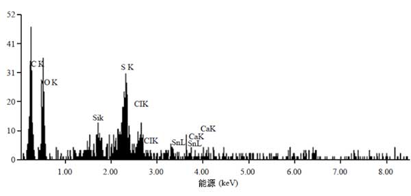 ¡¡¡¡ÄÜÁ¿É«É¢XÉäÏß·ÖÎö£ººÏ³ÉµÄ´óÂó¿ÇÑÜÉúµÄ»îÐÔÌ¿µÄÄÜÁ¿É«É¢XÉäÏß(EDX)¹âÆ×Èçͼ2Ëùʾ¡£ÔÚÎü¸½¼ÁÖмì²âµ½µÄÔªËØÊÇ£ºC£¬O£¬Si£¬S£¬Cl£¬SnºÍCa£¬»îÐÔÌ¿ÖÐCÊÇÖ÷Òª³É·Ö£¬È»ºóÊÇÑõ¡£