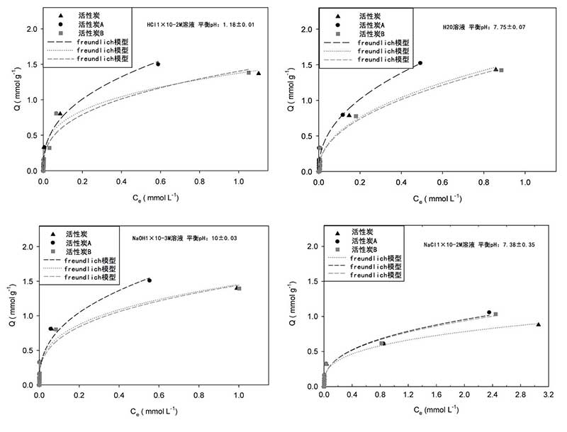 图3:分别显示了在不同溶液中三种活性炭在20℃下对羟基苯甲酸甲酯的吸附等温线。