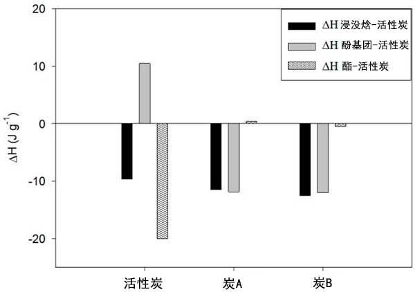 为了确定酯基在吸附质-吸附剂相互作用中的贡献,从对羟基苯甲酸甲酯-活性炭和苯酚-活性炭的相互作用焓开始计算相互作用的焓酯-活性炭。对于该计算,假设焓是分子的加成组成性质,因此对羟基苯甲酸甲酯-活性炭的相互作用焓对应于苯酚和酯与活性炭相互作用焓的总和。图4中显示了对羟基苯甲酸甲酯-活性炭,苯酚-活性炭和酯基团在水中吸附物-吸附剂的相互作用中的贡献。