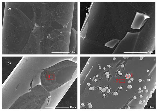 ¡¡¡¡Í¼1ÖеÄFESEMͼÏñÏÔʾÁËÑõ»¯îѸÄÐÔ»îÐÔÌ¿º¬ÒøÏËάµÄ±íÃæÐÎ̬¡£ÔÚ»îÐÔÌ¿º¬ÒøÏËάµÄ±íÃæÉϹ۲쵽Ðí¶àÄÉÃ׿ÅÁ££¬»îÐÔÌ¿±íÃæµÄÕâÐ©ÒøÄÉÃ׿ÅÁ£±»¶þÑõ»¯îѱ¡Ä¤°ü¸²£¬Ëæ×ÅŨ¶ÈµÄÔö¼Ó£¬ËüÃǵÄÖ±¾¶´ÓÔ¼0.2μm¼±¾çÔö¼Óµ½1μm¡£µ±Å¨¶È´ïµ½0.4mol/Lʱ£¬ÒøÄÉÃ׿ÅÁ£²»Äܱ»¶þÑõ»¯îѱ¡Ä¤ÍêÈ«¸²¸Ç¡£¶øÇÒ£¬»îÐÔÌ¿ÏËάÉϵĶþÑõ»¯îÑĤµÄºñ¶È²»¾ùÔÈ¡£