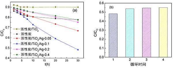 ¡¡¡¡Í¼2£º(a)Õ⼸ÖÖ»îÐÔÌ¿µÄÑǼ׻ùÀ¶È¥³ýЧ¹û£¬(b)¾ÀúÑ»·ÊÔÑéµÄ»îÐÔÌ¿º¬ÒøÏËάµÄÑǼ׻ùÀ¶È¥³ýЧ¹û¡£