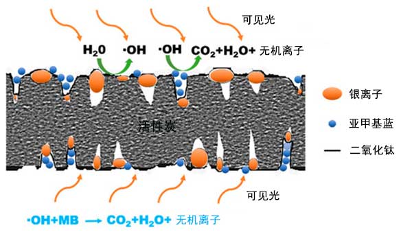 ¡¡¡¡Í¼2aʾ³öÁËÔڿɼû¹âÕÕÉäÏ»îÐÔÌ¿£¬¶þÑõ»¯îѸÄÐÔ»îÐÔÌ¿ºÍ¶þÑõ»¯îѸÄÐÔ»îÐÔÌ¿º¬ÒøÏËάµÄÑǼ׻ùÀ¶µÄÈ¥³ýЧ¹û¡£ÔÚ½Ó´¥µÄ³õʼ½×¶Î(0-5Сʱ)£¬ÓÉÓÚÆä·á¸»µÄ¿×϶£¬»îÐÔÌ¿³ýÈ¥Ô¼20%µÄÑǼ׻ùÀ¶¡£Ëæ×Åʱ¼äµÄÑÓ³¤£¬»îÐÔÌ¿µÄ¿×϶±»ÑǼ׻ùÀ¶×è¶Ï£¬ËüÃǵÄÎü¸½ÄÜÁ¦¼¸ºõ´ïµ½±¥ºÍ¡£Ïà±È֮ϣ¬¶þÑõ»¯îѸÄÐÔ»îÐÔÌ¿º¬ÒøÏËάÔÚÕû¸öʵÑé¹ý³ÌÖб£³ÖÁ˶ÔÑǼ׻ùÀ¶µÄÈ¥³ýЧ¹û£¬±íÃ÷ÕâÖÖ¸´ºÏ»îÐÔÌ¿²ÄÁÏÔڿɼû¹âÕÕÉäϾßÓÐ×ÔÔÙÉúÐÔÄÜ¡£Ëæ×ÅÒøº¬Á¿µÄÔö¼Ó£¬»îÐÔÌ¿µÄ×ÔÔÙÉúÐÔÄÜÏÈÔö¼Óºó½µµÍ¡£»îÐÔÌ¿µÄ×ÔÔÙÉúÐÔÄÜÓÉÁ½¸öÒòËØµÄÐͬ×÷Óþö¶¨£ºÎü¸½ºÍ¹â½µ½â¡£»îÐÔÌ¿µÄ¿×½á¹¹¿ÉÒÔÌá¸ßTiO 2ÖÜΧµÄÑǼ׻ùÀ¶Å¨¶È£¬´Ù½øÑǼ׻ùÀ¶¹â½µ½â¡£Í¬Ê±£¬ÑǼ׻ùÀ¶¹â½µ½â½«ÊͷŶÂÈûµÄ¿×϶£¬È»ºóʵÏÖ»îÐÔÌ¿×ÔÎÒÔÙÉú¡£»îÐÔÌ¿µÄ¿ÉÄܵÄ×ÔÎÒÔÙÉú»úÖÆÈçͼ3Ëùʾ¡£ÖÚËùÖÜÖª£¬´¿TiO 2Ö»ÄÜÔÚ×ÏÍâÏßÕÕÉäϹ⼤·¢¡£ÒøÀë×ӵĸºÔØÀ©´óÁ˹âÏìÓ¦ÇøÓò£¬Ìá¸ßÁËTiO 2µÄ¹â´ß»¯»îÐÔ¡£ÒøÀë×Ó±íÏÖ³ö±íÃæµÈÀë×Ó¹²ÕñЧӦ£¬ÆäÔڿɼû¹âÇøÓò²úÉúÇ¿ÁÒÇҹ㷺µÄÎüÊÕ¡£´ËÍâ£¬ÒøÀë×Ó¼ÓÔØºó²úÉú¸ü¶àµÄ¹âÉúµç×Ó£¬¹âÉúµç×ӺͿÕѨµÄ¸´ºÏÊܵ½ÒÖÖÆ£¬ÕâÁ½Õß¶¼Ìá¸ßÁËTiO 2µÄ¹â´ß»¯»îÐÔ¡£ËùÒÔÒøÀë×Óº¬Á¿Ó°ÏìTiO 2µÄ¹â´ß»¯»îÐÔ¡£µ±ÒøÀë×Óº¬Á¿²»×ãʱ£¬Ã»ÓÐ×ã¹»µÄ·´Ó¦Î»µãÀ´Ìá¸ßTiO 2µÄ¹â´ß»¯»îÐÔ¡£