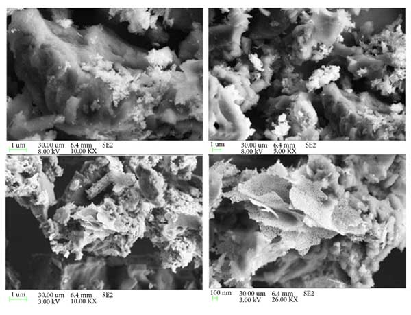 扫描电子显微镜分析:SEM研究证实了氧化锌在活性炭载体上的负载,图1示出了活性炭的SEM图像。可以看出,活性炭呈细孔的不规则图案。另外,氧化锌颗粒沉积在活性炭的表面和孔中。仔细观察表明活性炭表面上的片状氧化锌结构。