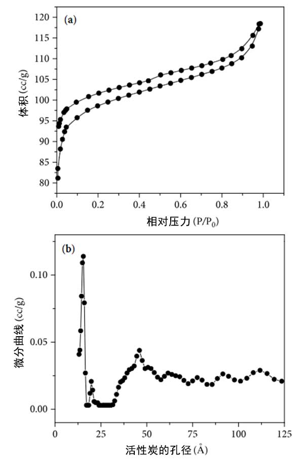 图2:(a)氮物理吸附等温线和(b)活性炭载氧化锌光催化剂的孔径分布图。