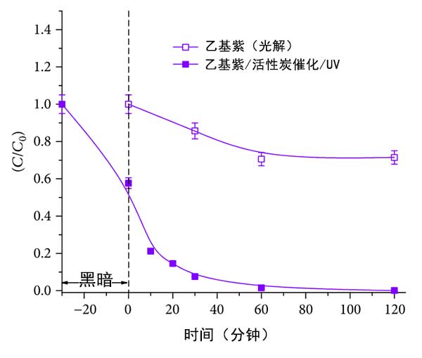图4:在紫外线照射下在活性炭催化剂存在下直接光解和乙基紫降解的曲线图。
