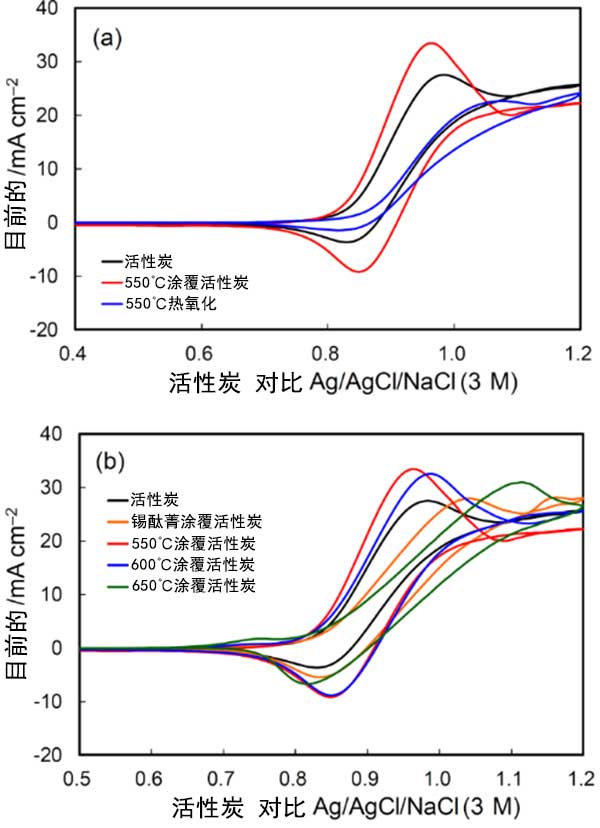 ¡¡¡¡¶ÔÓÚ»îÐÔÌ¿ºÍÎý̪ݼͿ¸²»îÐÔÌ¿£¬Í¼2ÖÐÏÔʾÁ˶ÔÓ¦ÓÚº¬Óз°Àë×ÓµÄËáÐÔµç½âÖÊÖеÄÕýµç¼«ºÍ¸ºµç¼«·´Ó¦µÄµçλ·¶Î§ÄÚµÄCV ¡£»¹ÏÔʾÁË»îÐÔÌ¿µÄCVÓÃÓڱȽϡ£ÔÚ»îÐÔÌ¿µç¼«ÉϵÄVO 2+ / VO 2 +Ñõ»¯»¹Ô·´Ó¦µÄÔöÇ¿·Ö±ðͨ¹ýÑõ»¯ºÍ»¹Ô·åµÄ¸º·åºÍÕý·åÒÆÎ»ÒÔ¼°Ôö¼ÓµÄ·åµçÁ÷Çå³þµØÖ¤Ã÷¡£¿¼Âǵ½ÏÈǰÑо¿ÖлñµÃµÄ±ßÔµÆ½Ãæ±©Â¶¶Ô»îÐÔµÄÓÐÏÞÔö¼Ó£¬ÕâÖÖÔöÇ¿¹éÒòÓÚ¶þÑõ»¯ÎýÄÉÃ׿ÅÁ£µÄ¸ºÔØ¡£Èç¹ûûÓжþÑõ»¯ÎýÖ»ÓÐÈÈÑõ»¯±íÃæµÄ»îÐÔÌ¿»îÐԽϵͣ¬ÆäÊܵ½VO 2 Îü¸½µÄÒÖÖÆ¡£ÓÉÓÚÕâÖÖÒÖÖÆ×÷Ó㬱ßÔµÆ½ÃæµÄ¹ý¶È±©Â¶µ¼Ö»îÐÔÌ¿µÄ»îÐÔ½µµÍ£¬²¢ÇÒÔÚ¸ÃÑо¿ÖÐÓÃÎý̪ݼͿ¸²»îÐÔÌ¿»ñµÃÁËÇ¿»¯µÄ»îÐÔ¡£±íÃæ½á¹¹µÄ¼±¾ç±ä»¯¹éÒòÓÚÑõ»¯ÎýÄÉÃ׿ÅÁ£¶Ô»îÐÔÌ¿±íÃæÑõ»¯µÄζÈÒÀÀµÐÔ´ß»¯×÷Ó㬵¼Ö¾«Ï¸Ê´¿Ì¡£