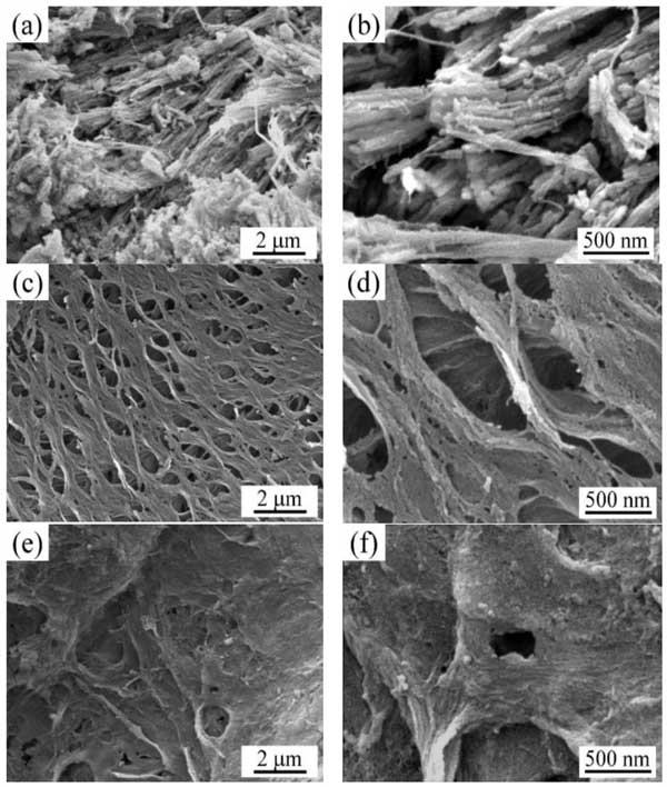 ¡¡¡¡Í¼1£º(a£¬b)Ô²ÄÁϵÄSEMͼÏñ(c£¬d)Ì¿»¯Ô²ÄÁÏ(e£¬f)»î»¯ºóµÄ»îÐÔÌ¿¡£