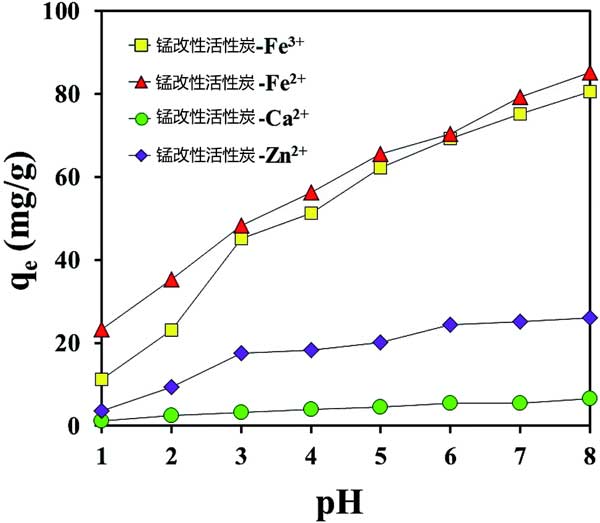 ¡¡¡¡Í¼2£ºpH¶Ô¸ßÃÌËá¼Ø¸ÄÐÔ»îÐÔÌ¿Îü¸½½ðÊôÑôÀë×ÓµÄÓ°Ïì¡£