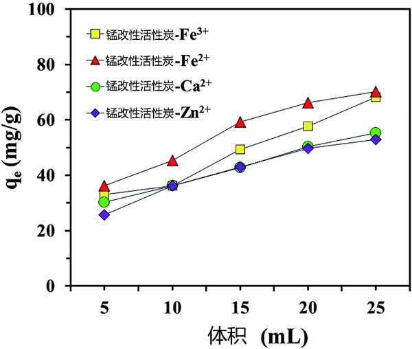 ¡¡¡¡Í¼3£ºÊ¹Óò»Í¬Ìå»ýµÄÏõËá´ÓÃ̸ÄÐÔ»îÐÔÌ¿ÖнâÎü½ðÊôÑôÀë×Ó¡£