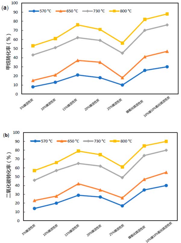 ¡¡¡¡Ê¹ÓÃ΢²¨×÷Ϊ¼ÓÈȽéÖÊ£¬ÔÚ²»Í¬Î¶Èϼ×ÍéºÍ¶þÑõ»¯Ì¼ÔںϳɻîÐÔÌ¿ÉϵÄת»¯Èçͼ2Ëùʾa£¬b£¬·Ö±ð¡£¿ÉÒÔ¿´³ö£¬·´Ó¦Î¶ȵÄÉý¸ß¼ÓËÙÁËÖØÕû·´Ó¦£¬µ¼Ö·´Ó¦ÎïÔڽϸßζÈϵÄת»¯Âʽϸߡ£ÈçËùÖ¤Ã÷µÄ£¬ÔÚÔØÄø»îÐÔÌ¿´ß»¯¼ÁÖУ¬15%µÄÄø¸ºÔØÁ¿·Ö±ð±íÏÖ³ö×î¸ßµÄת»¯ÂÊ£¬ÆäÖм×ÍéºÍ¶þÑõ»¯Ì¼·Ö±ðΪ76%ºÍ79%¡£Ëæ×ÅÄøº¬Á¿µÄÔö¼Ó£¬×ª»¯ÂʳÊϽµÇ÷ÊÆ¡£¹Û²ìµ½µÄÇ÷ÊÆ¿ÉÄÜÓëÕâЩ»îÐÔÌ¿µÄÇâÎüÊÕºÍÄø·ÖÉ¢½á¹ûÓйأ¬Õâ±íÃ÷ÁËÏàͬµÄÇ÷ÊÆ¡£½á¹û±íÃ÷£¬Ëæ×ÅÄøº¬Á¿µÄÔö¼Ó¸ß´ï15%£¬¿ÉÓÃÓÚÎü¸½·´Ó¦ÆøÌåµÄλµãµÄÊýÁ¿Ôö¼Ó¡£´ËÍ⣬·¢ÏÖÏò»îÐÔÌ¿ÖмÓÈëÑõ»¯Ã¾¶Ô´ß»¯¼ÁµÄ»îÐÔÓлý¼«µÄÓ°Ïì£¬Ê¹ÔØÄøÑõ»¯Ã¾»îÐÔÌ¿´ß»¯¼ÁµÄ¼×Íéת»¯ÂÊÌá¸ßµ½84%ºÍ88%¡£ÕâЩ´ß»¯¼ÁµÄÇâÎüÊպͷÖÉ¢½á¹û±íÃ÷£¬Í¨¹ýÌí¼ÓÑõ»¯Ã¾£¬»îÐÔÌ¿ÔØÌåÉϵÄÄø·ÖÉ¢ÌåµÃµ½ÔöÇ¿£¬Òò´ËÖØÕû·´Ó¦µÄ»îÐÔλµãÊýÔö¼Ó¡£½«Õ⼸ÖÖ»îÐÔÌ¿½øÐбȽϣ¬·¢ÏÖºóÔØÄøÃ¾»îÐÔÌ¿µÄת»¯Âʸü¸ß¡£Õâ¿É¹éÒòÓÚÒÔÏÂÊÂʵ£ºÍ¨¹ý¹²½þ×ÕÑõ»¯ÄøºÍÑõ»¯Ã¾£¬²¿·ÖÑõ»¯ÄøÏཫλÓÚÑõ»¯Ã¾²ãÏ·½£¬Ê¹µÃËüÃDz»Äܱ»·´Ó¦ÆøÌå½Ó´¥¡£